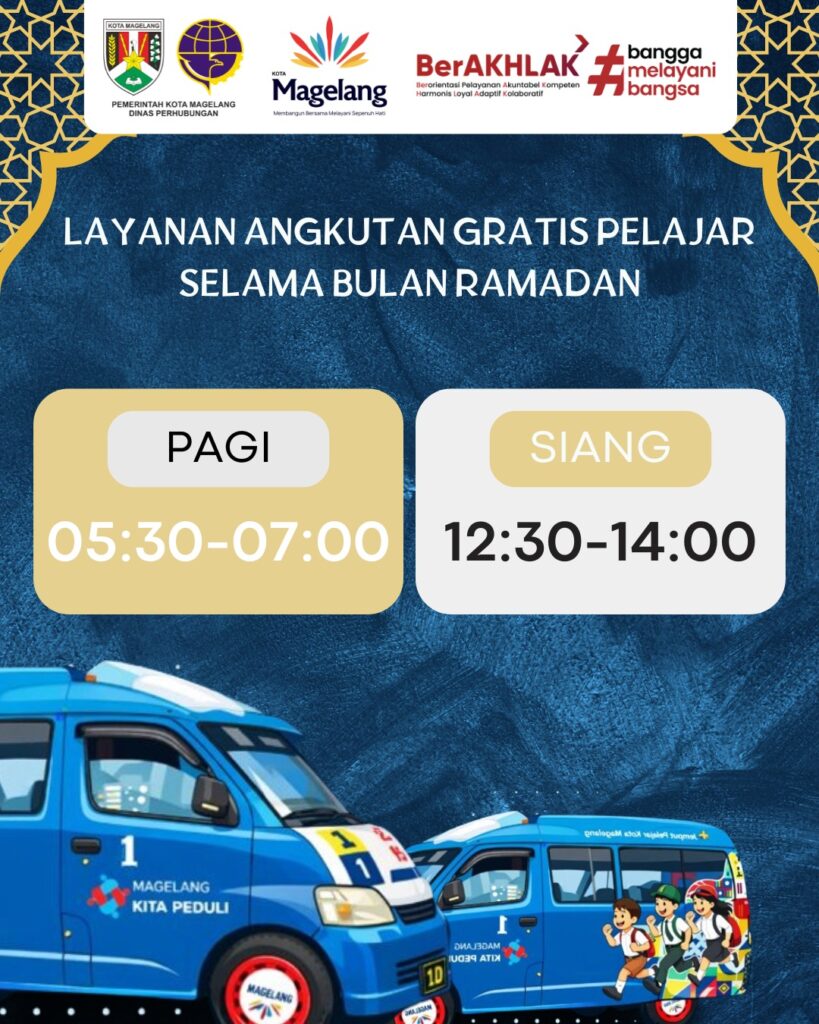 Dalam rangka mendukung kelancaran kegiatan belajar mengajar selama bulan suci Ramadan, Pemerintah Kota Magelang melalui Dinas Perhubungan Kota Magelang melakukan penyesuaian jam operasional Layanan Angkutan Pelajar Gratis. Penyesuaian ini diberlakukan khusus selama bulan Ramadan dan menyesuaikan dengan kebijakan jam sekolah Ramadan yang menerapkan sistem 5 (lima) hari sekolah, Senin sampai dengan Jumat, di seluruh wilayah Kota Magelang.